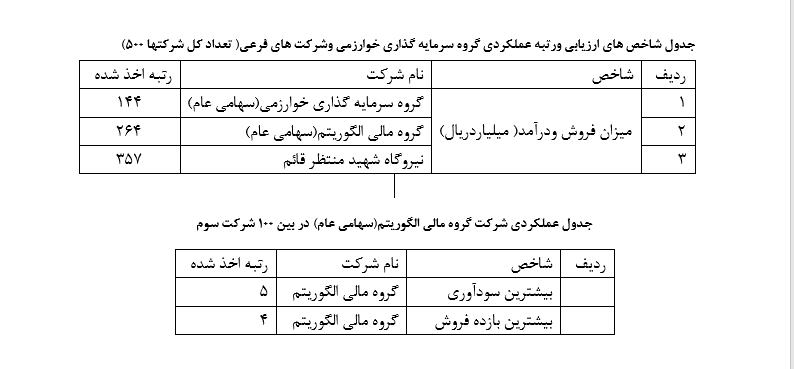 نتیجه شرکت در همایش شرکت های برتر ایران( IMI – 100) که در تاریخ ششم بهمن ماه جاری برگزار شد به شرح ذیل ارائه گردیده است: